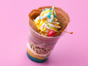 ベースは、ピーチ&ベリーゼリー、マンゴー&ブルーゼリー。ソースがラズベリー、トロピカルフルーツ、チョコレートシロップ。そしてトッピングがカラフルポップシュガー、ドライストロベリー&ビスケット。