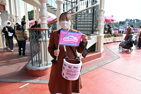 まず体験したのは、「春ディズニー!学生限定くじ」。中学生、高校生、大学生、大学院生、短大生、専門学校生が対象で、特別なバケツを持ったキャストに学生証を提示するとくじを1回引けるというもの。