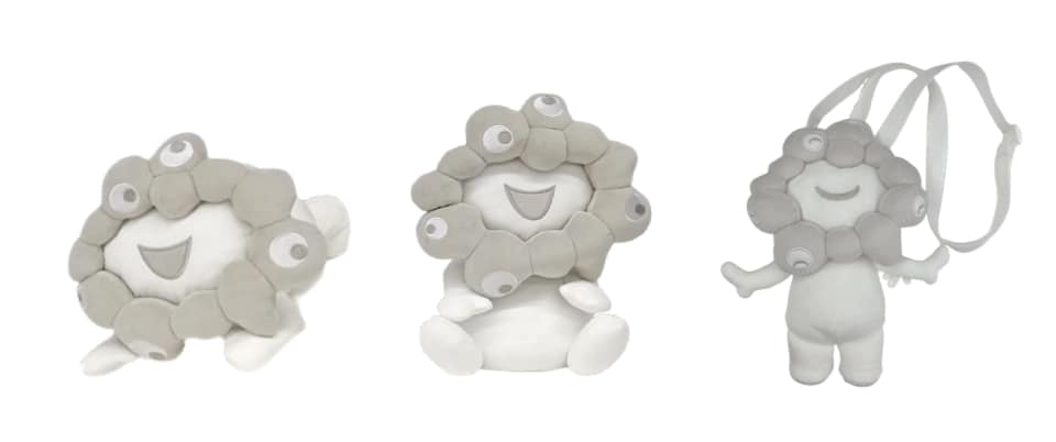 ヘソプロダクションは、大阪・関西万博の公式ライセンス商品として“白ミャクミャクVer.”の「お手玉風ぬいぐるみ」「這型ぬいぐるみ」「全身ぬいぐるみポーチ」を2月中旬に発売する。