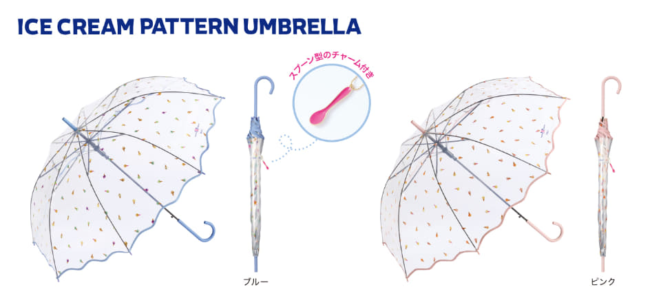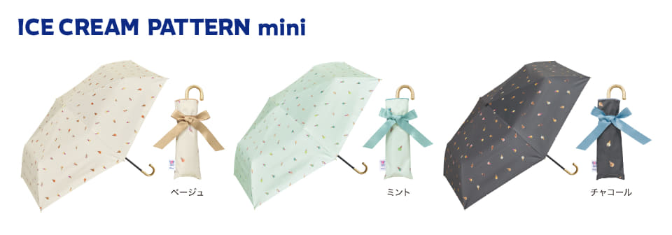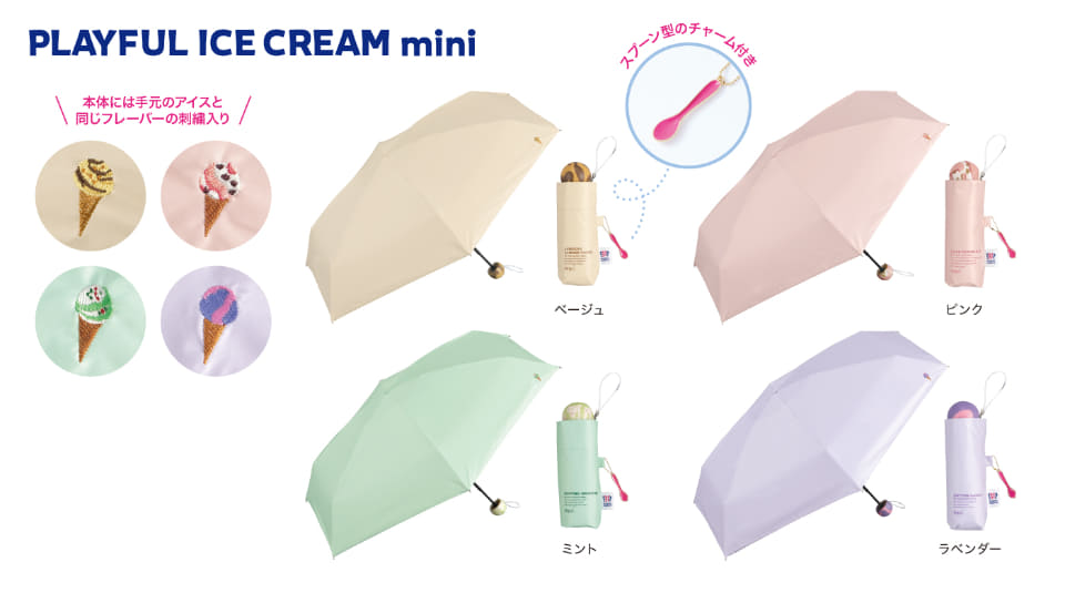「甘くて、涼しい。“夏の人気者”」をテーマに、傘の持ち手を人気フレーバーで表現した晴雨兼用折りたたみ傘「遮光プレイフルアイスクリームミニ」(4色・各4730円)、さまざまなフレーバーを散りばめた「遮光アイスクリームパターンミニ」(3色・各4620円)、ビニール傘の「アイスクリームパターンアンブレラ」(2色・各3410円)をラインアップしている。
