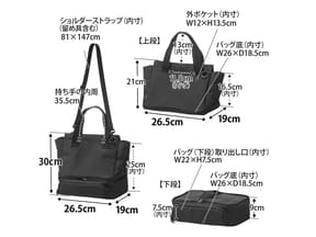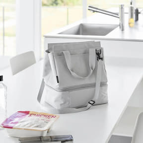 トート・ショルダーの2WAYで使えるバッグと、保冷・保温タイプのランチバッグのセット。2WAYバッグの底面とランチバッグの天面はファスナーで接続でき、連結・分割両方の使用に対応する。カラーはライトグレー、ブラックの2種類。