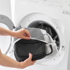 ランチバッグは側面に大きな開口部を取っており、内側にはカトラリーを固定するゴムバンド付き。傾けることなく弁当を収納できるほか、500mLのペットボトルを3本しまえる。汚れた際の丸洗いにも対応する(2WAYバッグは洗濯不可)。