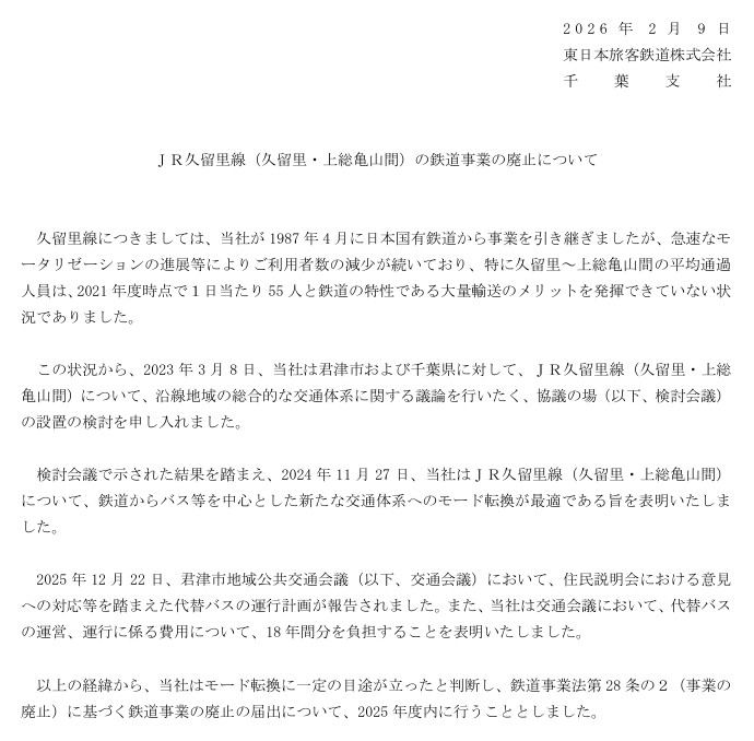 JR東日本、久留里線 久留里~上総亀山の廃止を正式発表。3月までに廃止届提出、代替バス費用を18年分負担
