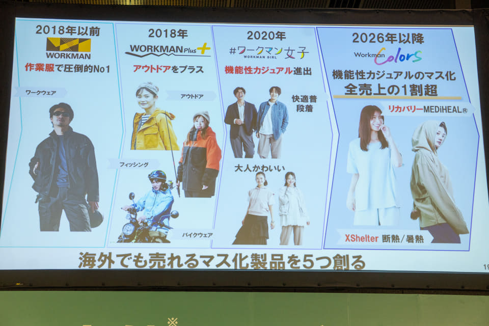 このほか春夏シーズンは、世界初の新断熱材「XShelter」を用いた“着たほうが涼しい”暑熱対策アパレルなども一般客向けに強化していく。新成長ビジョンとして、従来の多品種少量生産だった「工務店業」から、少数の重点商品で売上の大部分を作る「マス製品業」への転換を図り、小売業としての地位向上を目指す。