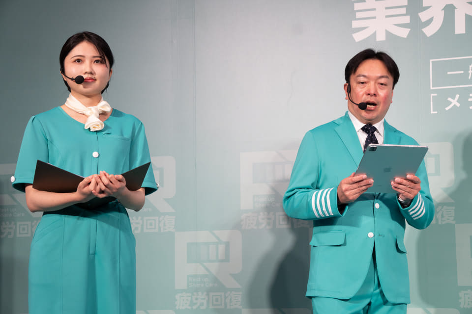 「リカバリー航空 メディヒール便」と題されたこのステージでは、CAに扮した司会者、機長に扮したワークマン開発担当者の北村武士氏とともに、“移動中や旅先でのリカバリー”をテーマにトークを展開。昨年話題となった“メディヒール即完売で買えない問題”について、武井さんは「とてつもない数のDMが届いた」という。