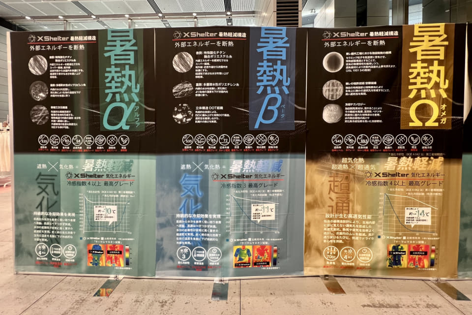 さらにこの春夏シーズンからは、東レの技術を組み合わせて新たに開発した暑熱緩和素材「XShelter 暑熱Ω」が初登場。はじめは、特に緊急性の高い職人・プロ向けのワークウェアに用いて販売する予定で、今後は一般向けウェアへの応用も検討中とのこと。暑熱α・β・Ωの違いは以下のとおり。