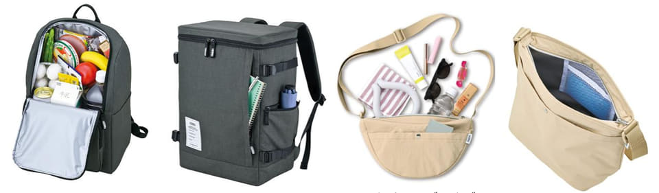 ストラップの長さ調節が可能な「保冷ショルダーバッグ」では、ハーフムーン型・容量約3.5Lのモデル(RFM-003)と、ボックス型・約7Lのモデル(RFO-007)を展開する。