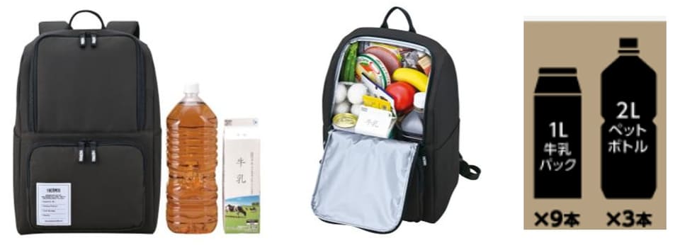 「保冷バックパック」は、一般的なリュック型の約16Lモデル(RFP-016)と、たためるスクエア型の約25Lモデル(RFP-025)をラインアップ。RFP-016は2Lペットボトルが3本、RFP-025なら8本入る。