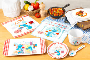 劇中に登場するシェフハット風のカチューシャ(2600円)や、肩にちょこんと乗せて楽しめるくっつきぬいぐるみ(2800円)など、レミーの相棒として奮闘する青年アルフレッド・リングイニ気分でパークを巡れる。ほかにも、春の新生活や食卓を飾る雑貨類やキッチン用品が揃う。
