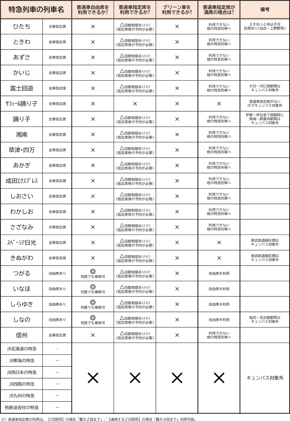 対象路線: JR東日本全線、青い森鉄道線、いわて銀河鉄道線、三陸鉄道線、北越急行線、えちごトキめき鉄道線(直江津〜新井間)の新幹線や特急列車、普通・快速列車の普通車自由席およびBRT
