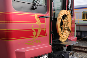 貫通扉には、“南海沿線への旅の広がり”を表現した大きなエンブレムを取り付けている。全体のモチーフは羅針盤で、中央から伸びる針のアルファベットはそれぞれ「難波」「関西空港」「和歌山」「高野山」を表現した。羅針盤を取り囲む12の三角形は時計(時間)を表わしたものだ。