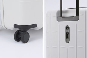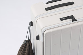 さらに、走行音を抑え旋回性に優れた静音双輪キャスターを採用し、電車内などでの不意な走行を防げるキャスターストッパーのレバーを背面に装備。預け入れサイズでは側面にお土産袋などを掛けられるサイドフックを備えている。フックは底足も兼ね、横向きに置いた際の安定性を高める役割も果たす。