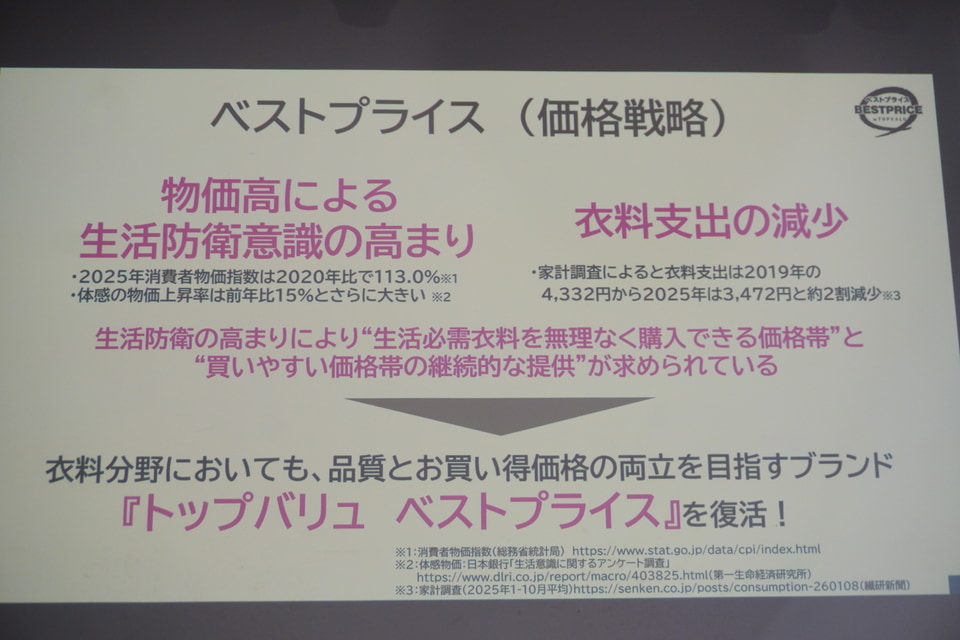 実はブランド戦略の変化にともなって、衣料における「ベストプライス」は2022年ごろからほぼ姿を消していた。今回の商品展開は、いわば4年ぶりの再始動となる。