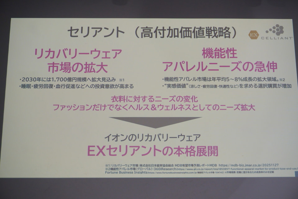 リカバリーウェア市場では2025年比で、2026年に10倍、2030年には100倍の売上高を目指すとしている(セリアント・EXセリアント計)。