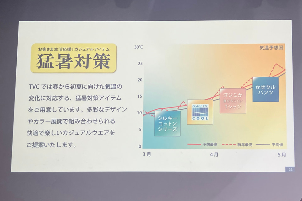 イオンの衣料売場で展開している「TVC」(ティーヴィシー)ブランドでは、猛暑対策をキーワードとし、Tシャツを中心とした夏向けのアイテムを発表した。新商品のほか、既存商品のブラッシュアップもポイントとし、機能の向上をはかっている。各商品は2月以降に発売する予定。