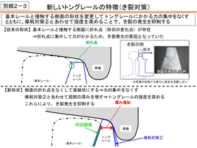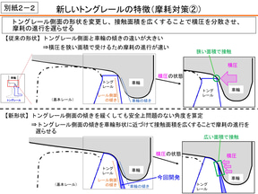 新しいトングレールでは、頭頂面と側面の形状を変更。頭頂面は従来より位置を高くすることで車輪のより内側(直径の大きな部分)でレールと接触するようになり、横からの圧力を減らすことで摩耗しづらくした。