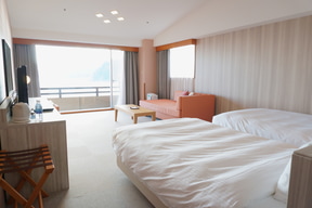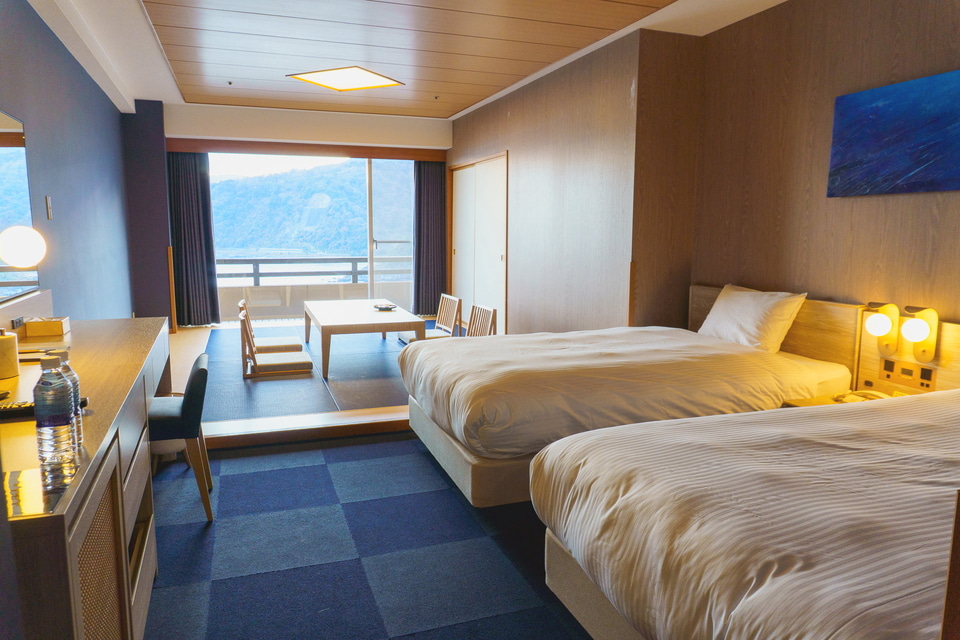 赤沢温泉ホテルの客室数は全77室(本館51室、南館26室)で、今回宿泊したのは本館7階のスタンダード和洋室。南館1階以外はオーシャンビューとなっており、どこまでも続く空と海の景色、窓を開けると聞こえてくる心地よい波の音に癒やされた。
