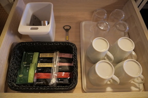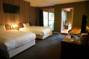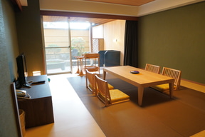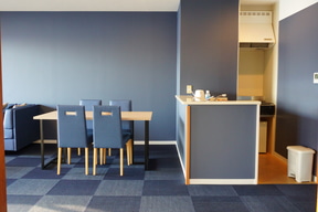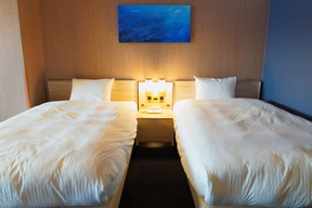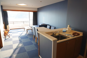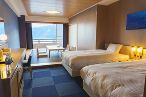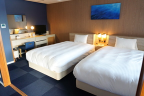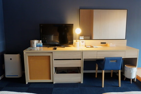 客室内にはテレビ、冷蔵庫、湯沸かしポット、お茶セット、お着き菓子、ペットボトルのお水(海洋深層水)、加湿器などが備えられており、無料のWi-Fiも全室完備。
