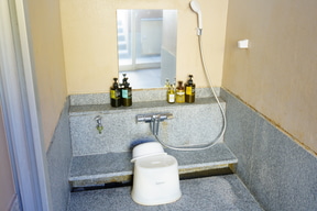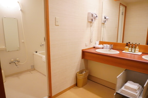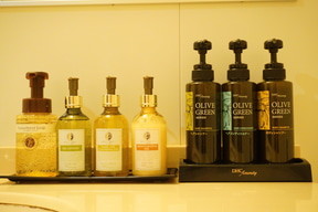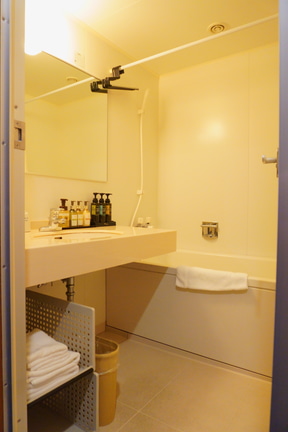 トイレとお風呂は別で、洗面台はバスルーム内にある。シャンプー/コンディショナー/ボディーソープ/ハンドウォッシュだけでなく、クレンジングオイル/ジェルローション(化粧水)/ミルキージェル(乳液)もすべてDHCのアメニティを利用可能。同じボトルが各温浴施設にも用意されている。