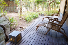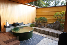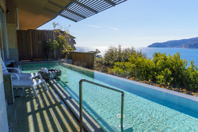 本館屋上階には、貸切露天風呂も伊豆・赤沢の2室用意。大浴場よりも空に近く、プライベートな空間で絶景を楽しめるので、子連れの家族やカップル、友人同時でぜひ利用してみてほしい。当日予約制で、料金は1時間3300円。利用時間は7時~11時、15時~22時となっている。