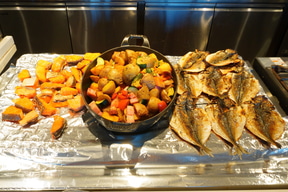 当日のメニューは、ぶり・びんちょうまぐろなどのお刺身、揚げたてのアジフライや温められた干物、焼きたてのパン、自家製プリン、スムージーやビネガードリンク(フルーティス)など。野菜もフレッシュなサラダとごろごろとしたグリル、煮物・きんぴら・ごまあえといったさまざまなスタイルで用意されていた。
