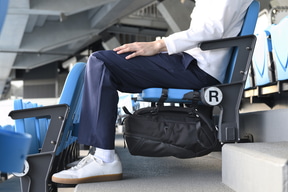 また、バッグは座席に取り付けた状態でも側面ファスナーまたは上部ファスナーからメイン収納部にアクセスできるほか、チラシを折らずに収納できるビラポケットや取り外して使えるサコッシュを備える。本体生地は耐水性・耐久性に優れるポリエステルで、屋外観戦にも対応する。