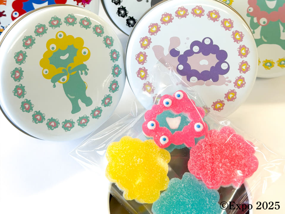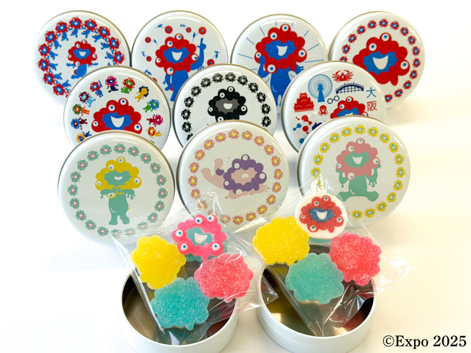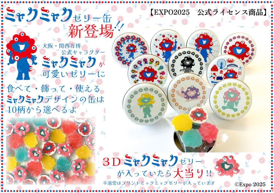 大阪・関西万博やオフィシャルストアでも人気を集めた商品で、ミャクミャクをデザインした缶の中に、カラフルな細工ゼリー(半生菓子)を4つ詰め合わせたもの。大阪観光を楽しむミャクミャクや黒ミャクミャクといった既存の缶デザインに加えて、今回新たにパステルカラーの3種類(顔まわりのリングがピンク、イエロー、パープル)の缶が加わり、ラインアップは全10種となった。