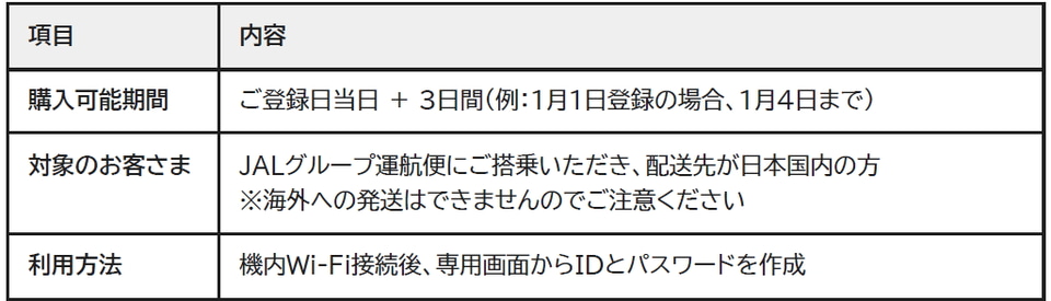 おうちで機内販売は、搭乗中に機内Wi-Fiを通じて専用ID・パスワードを作成することで、日本国内への配送を対象として搭乗後3日間限定でオンラインショッピングを楽しめるサービス。