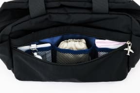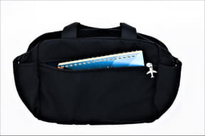 ガバッと開いてモノが取り出しやすいミニボストン形で、サイズは約26×12×20cm(幅×奥行×高さ)。内側には日本旅行コーポレートカラーのブルーを採用することで、荷物を見つけやすい仕様とした。ファスナーの引き手には、飛行機のチャームも付く。