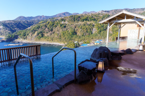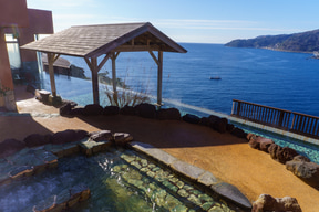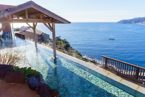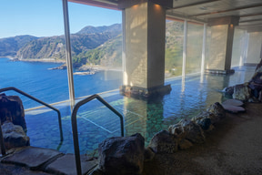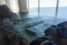 海と空の大パノラマが広がる露天風呂(インフィニティ温泉)をはじめ、「海のねころびラウンジ」や温暖浴、タイ式マッサージなど、一日を通してくつろげる日帰り温泉施設。