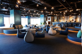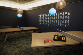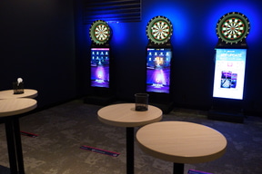 深海をイメージしたプレイラウンジ。ダーツやビリヤード、卓球台、ボードゲームなどがあり、お酒やソフトドリンクも追加料金なしで楽しめる。