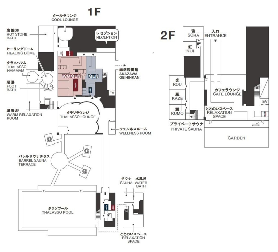 赤沢沖の深海800mから組み上げた新鮮な海水を100%使用した「海洋深層水タラソプール」をはじめ、木の温もりに包まれる樽型サウナ「バレルサウナ」やプライベートサウナ(別料金)、フィンランド式ドライサウナ、岩盤浴、温暖浴など全9種類の温浴コンテンツを利用できる。