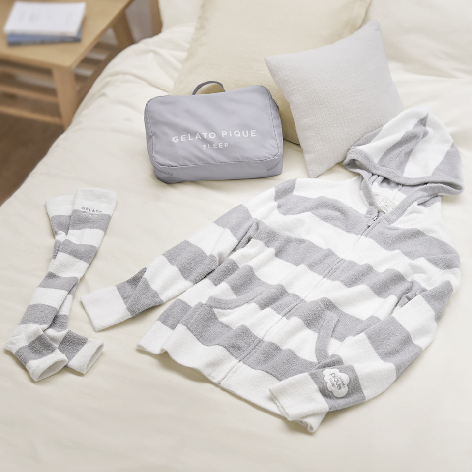 gelato piqueの寝具ライン「gelato pique Sleep(ジェラート ピケ スリープ)」とのコラボアイテムとして、JALロゴ入りのパーカと着圧ソックスに、収納ポーチの付いた3点セットが登場。大人っぽいグレーカラーで統一している。