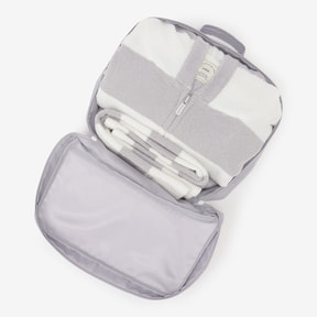 パーカとソックスをまとめてコンパクトに収納できるポーチは、持ち手つきでパッキングケースとしても活用できるという。