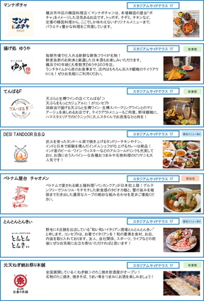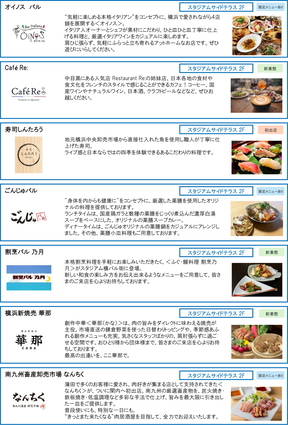スタジアムサイドテラスとザ レガシーの2棟にまたがる「スタジアム横バル街」には、横浜生まれ「TDM 1874 Brewery」のタップルーム、地元横浜中央卸売市場から直接仕入れた魚を使用した「寿司しんたろう」、横浜中華街「馬さんの店 龍仙」の姉妹店「馬姐 麻辣湯(マージェ・マーラータン)」、関東初出店の「九州屋台 愛す村」、日本初上陸「ベトナム屋台 チャオメン」など34店舗の小型店舗が集結。路面店が立ち並ぶようにデザインされた空間で、国内外のバラエティ豊かな料理が味わえるという。