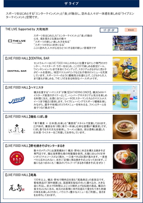 スポーツをはじめとするエンターテインメントと食が融合するエリア「ザ ライブ」には、横浜DeNAベイスターズ直営のダイナーやフラッグショップのほか、野毛焼きそばセンターまるきなど飲食店が複数オープンする。