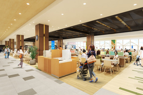 3階のフードコートは名称を「FOOD PARK」に改め、和泉市の豊かな自然をテーマにしたデザインに一新。ファミリー層の利便性を高めるため、中央エリアにBOX席を新設するほか、奥の「こもれびガーデン」には子供向けアニメを放映するモニターを設置する。