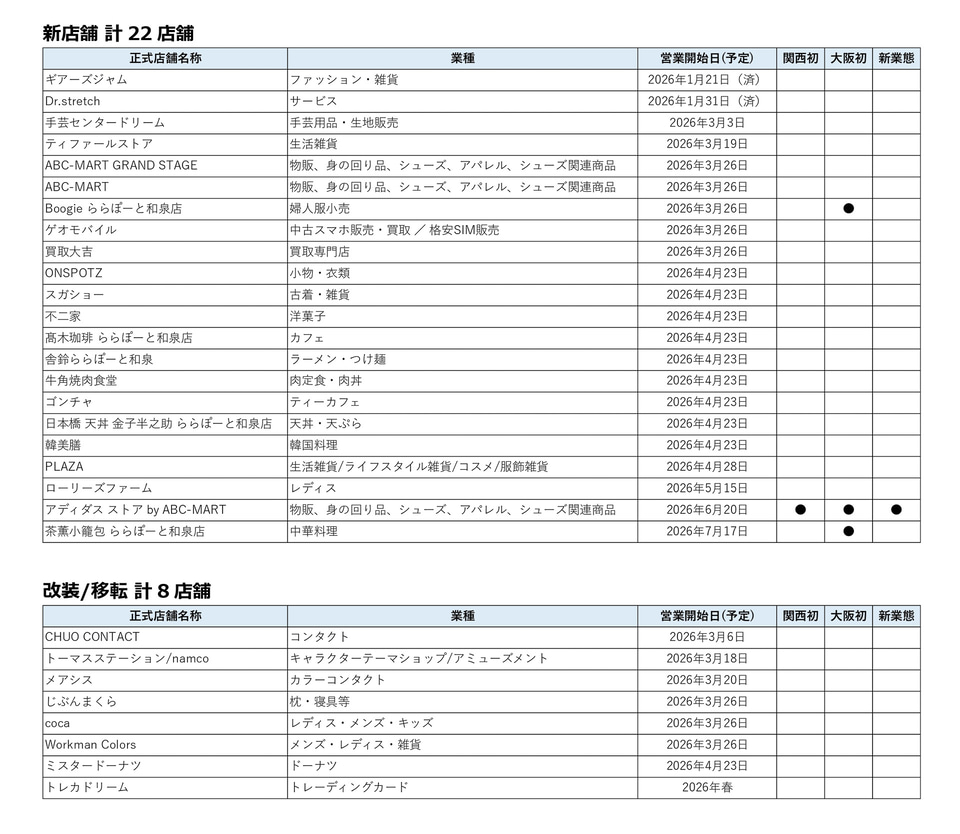 今回のリニューアルでは、関西初出店の新業態「アディダス ストア by ABC-MART」や大阪初出店の飲食店など話題のテナントが加わるほか、フードコートや子供向け遊び場といった施設環境を大幅にアップデートする。
