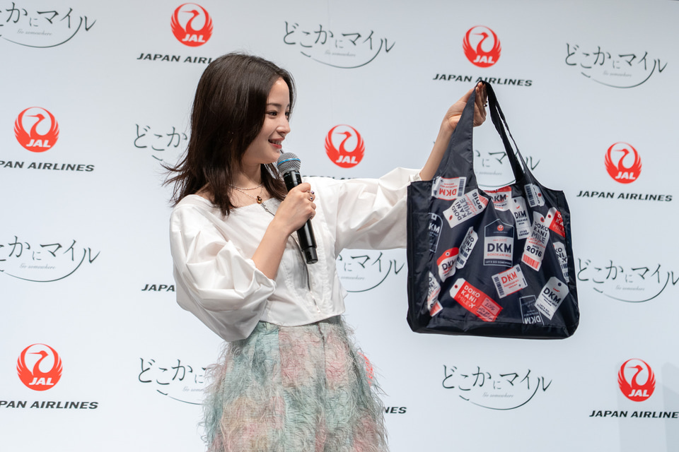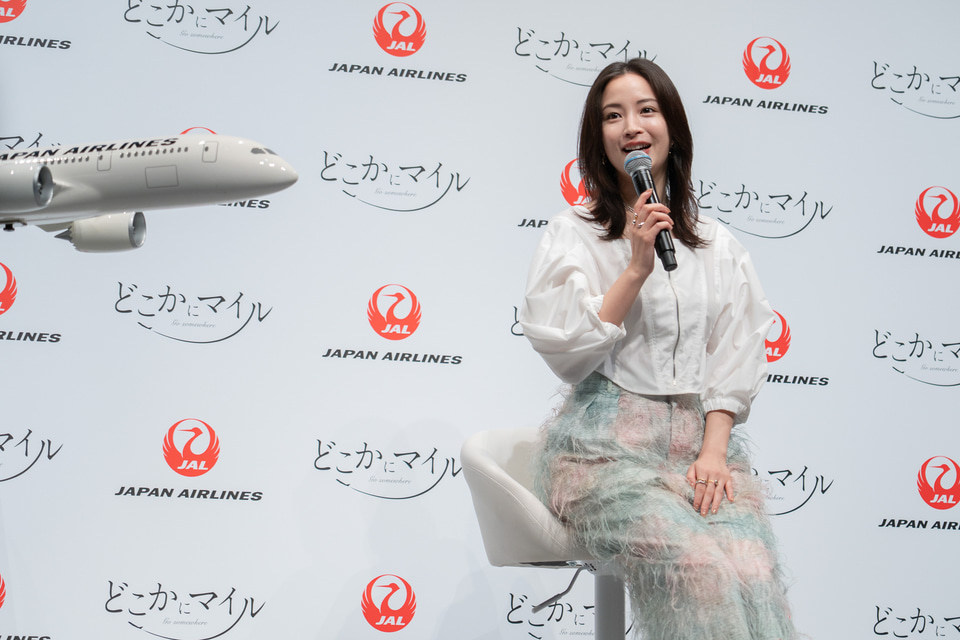 続いて壇上にはスペシャルゲストの広瀬すずさんが透明感のある春らしい衣装で登場。広瀬さんは2024年3月から「JALマイルライフ」のCMキャラクターを務めている。