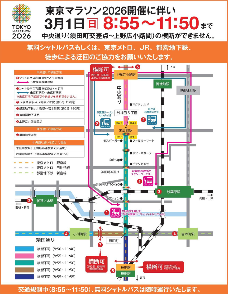 8時55分~11時50分に行なう秋葉原駅周辺の交通規制中は、つくばエクスプレス秋葉原駅から西側へ向かう際、歩行者でも中央通り(須田町交差点~上野広小路間)を通り抜けることができないため、無料シャトルバスを利用するよう案内している。