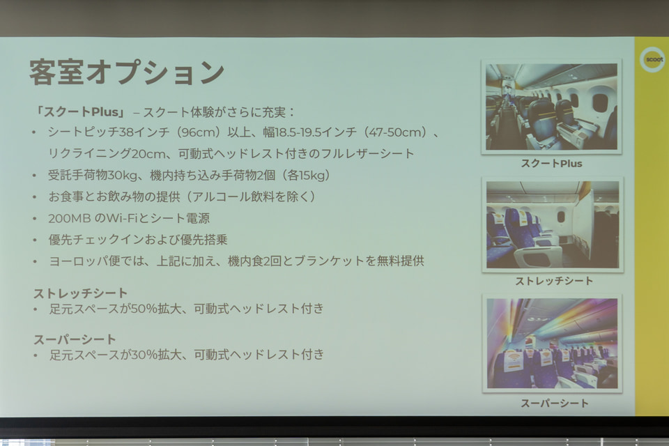 スクートの機材は、ボーイング 787-8型機、エアバス A320ファミリー、エンブラエル E190-E2型機の3つに大別でき、平均機齢は5年超と新しめ。329~375席で中長距離向けの787、236席で最大6時間までのA321neo、180~186席で最大5時間までのA320ceo/neo、112席で最大5時間までのエンブラエル E190-E2という棲み分けを行なっている。