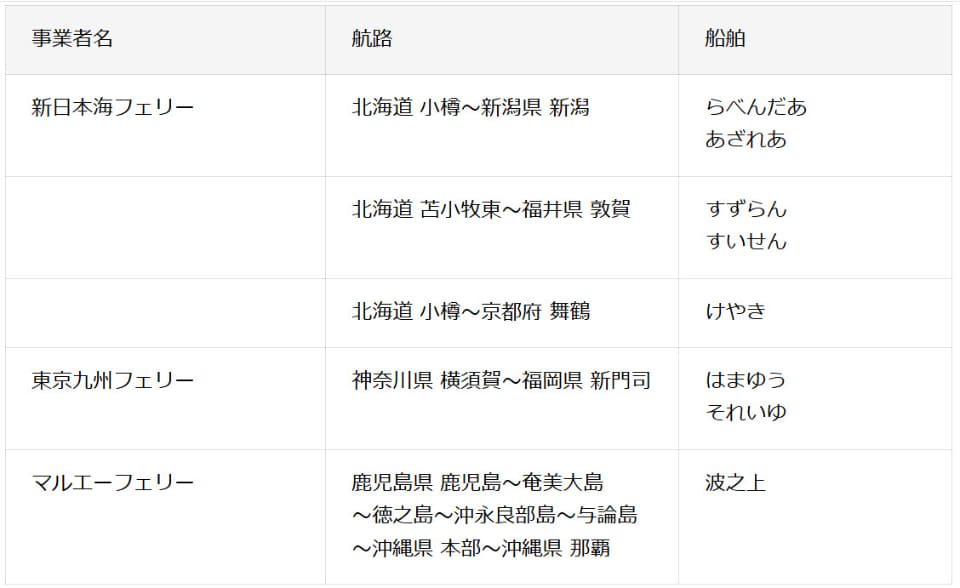 対象となる航路および船舶は以下のとおり。今後も順次拡大予定としている。