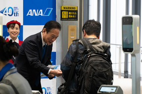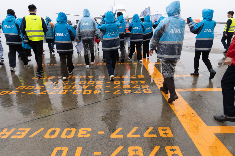 式典後、搭乗が始まると井上氏が先頭に立ちラゲージタグなどの入った記念品を配布し、外はあいにくの雨模様だったが、式典の対象便となったNH881便(成田~パース線)を多くのANAスタッフが横断幕とともに見送った。