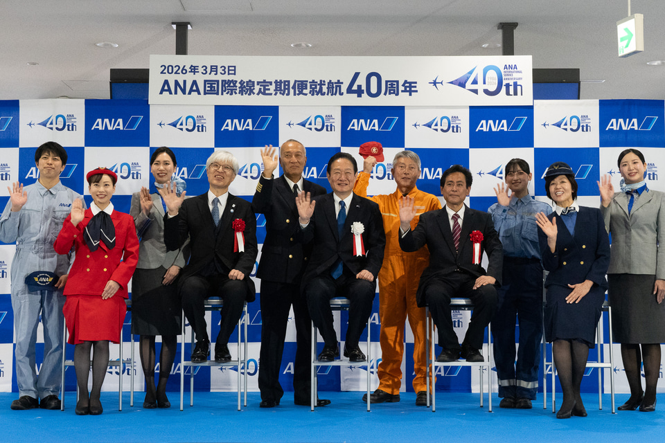 ANAは3月3日、国際線運航40周年の式典を成田空港で実施した。