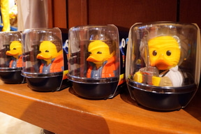 コレクションしたいグッズとして、バック・トゥ・ザ・フューチャーのタイムマシンのミニカー(1800円)、フレーム付きピンバッジセット(6個入り5900円)、各作品の登場人物になりきったアヒルのフィギュア(2000円/4400円)もぜひチェックしておきたい。