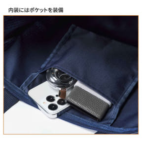 開口部は中身を隠せる天ファスナー仕様。小物が入る内ポケットと、ボトルなどを収納できるサイドポケットも搭載している。