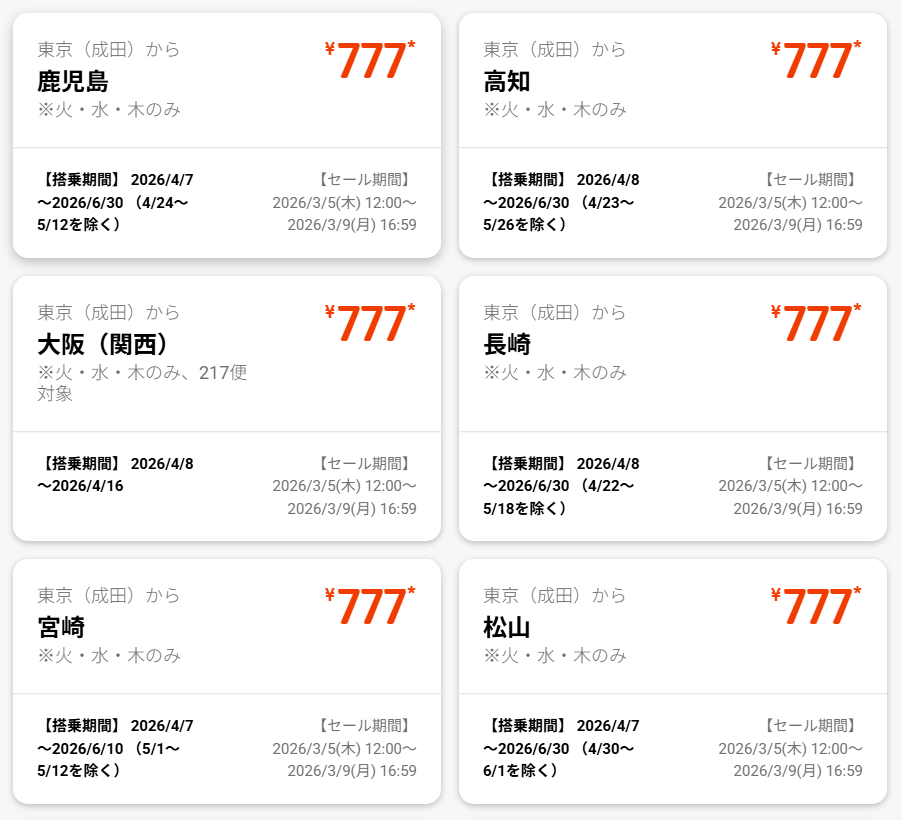 ジェットスター・ジャパンは、国内全路線が片道777円から、アジア全路線が7777円からの「最強開運日セール」を開催する。期間は3月5日12時~9日16時59分。