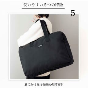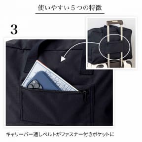 スーツケースなどにキャリーオンバッグできる仕様で、さらにキャリーバー通しベルト部分はファスナー付きポケットになっている。コンパクトにたたんで携帯も可能。
