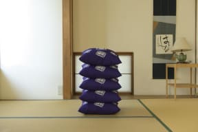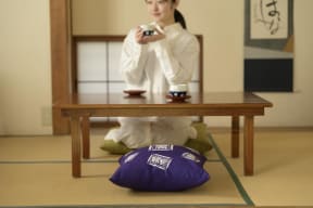 付録は「笑点の座布団」ほんものデザインのふわふわクッション。象徴的な深いむらさき色と、大きさ約40×15×40cmの存在感で、家やクルマのインテリアにも映えそう。