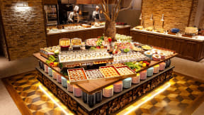 夕食バイキングでは、トリュフの赤ワインソースでいただく特製ローストビーフや海鮮鉄板焼きをライブで提供。また、ご当地グルメの小田原おでんにサンマーメン、沼津みかんを使った温製デザートのクレープシュゼットもラインアップしている。